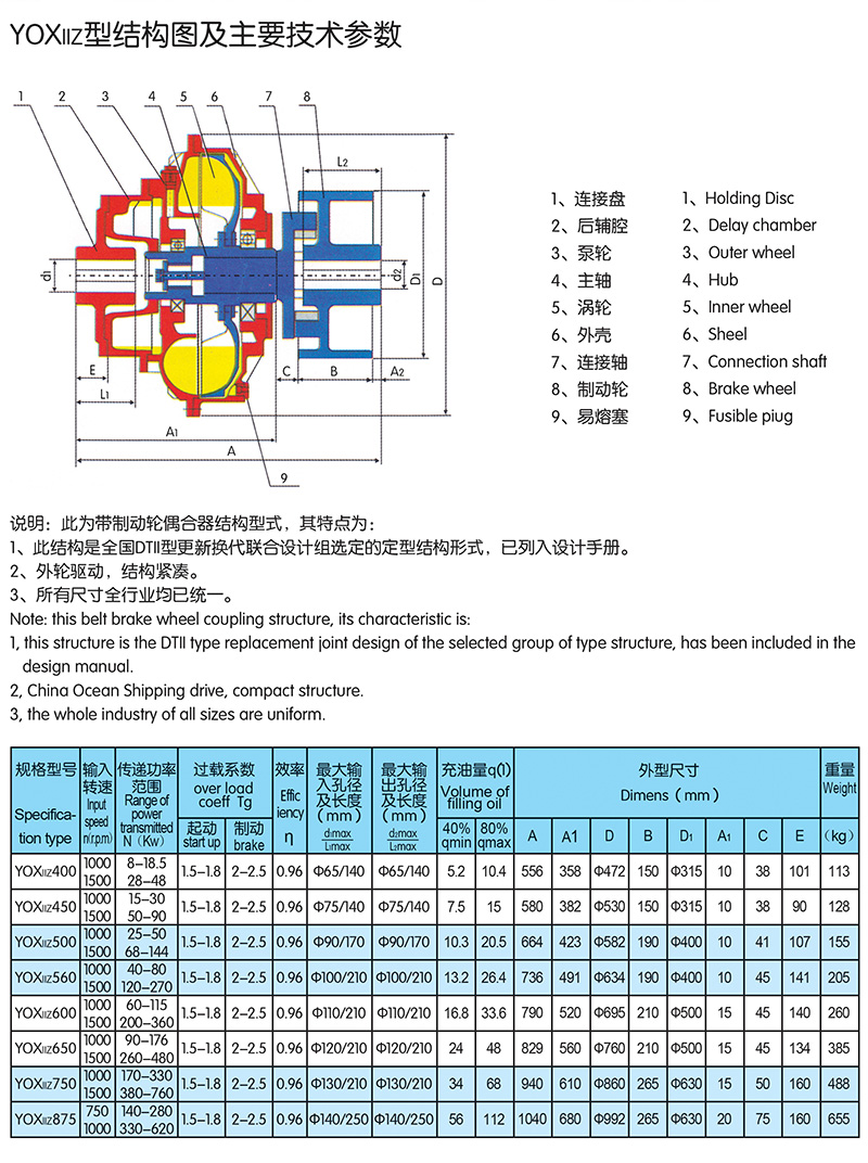 限矩型液力偶合器是一種動力式液力傳動元件,它具有過載保護作用,能隔離扭振和沖擊,在多臺電動機傳動鏈中均衡各電動機的負荷,并減小電網的沖擊電流。在礦山機械、化學工業、治金工業、食品、建筑、交通等部分得到了廣泛應用。 限矩型液力偶合器具有以下特點:效率高,結構簡單,能夠帶動負載平穩起動,改善起動性能,提高起動能力。 具有過載保護作用。能隔離扭振和沖擊。在多臺電動機傳動鏈中均衡各電動機的負荷。并減小電網的沖擊電流。
